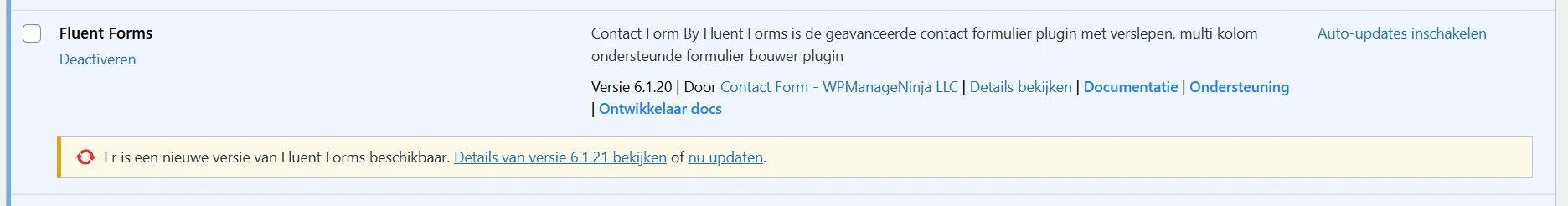 Als er een update beschikbaar is voor een plugin verschijnt er een gele balk zoals hieronder: